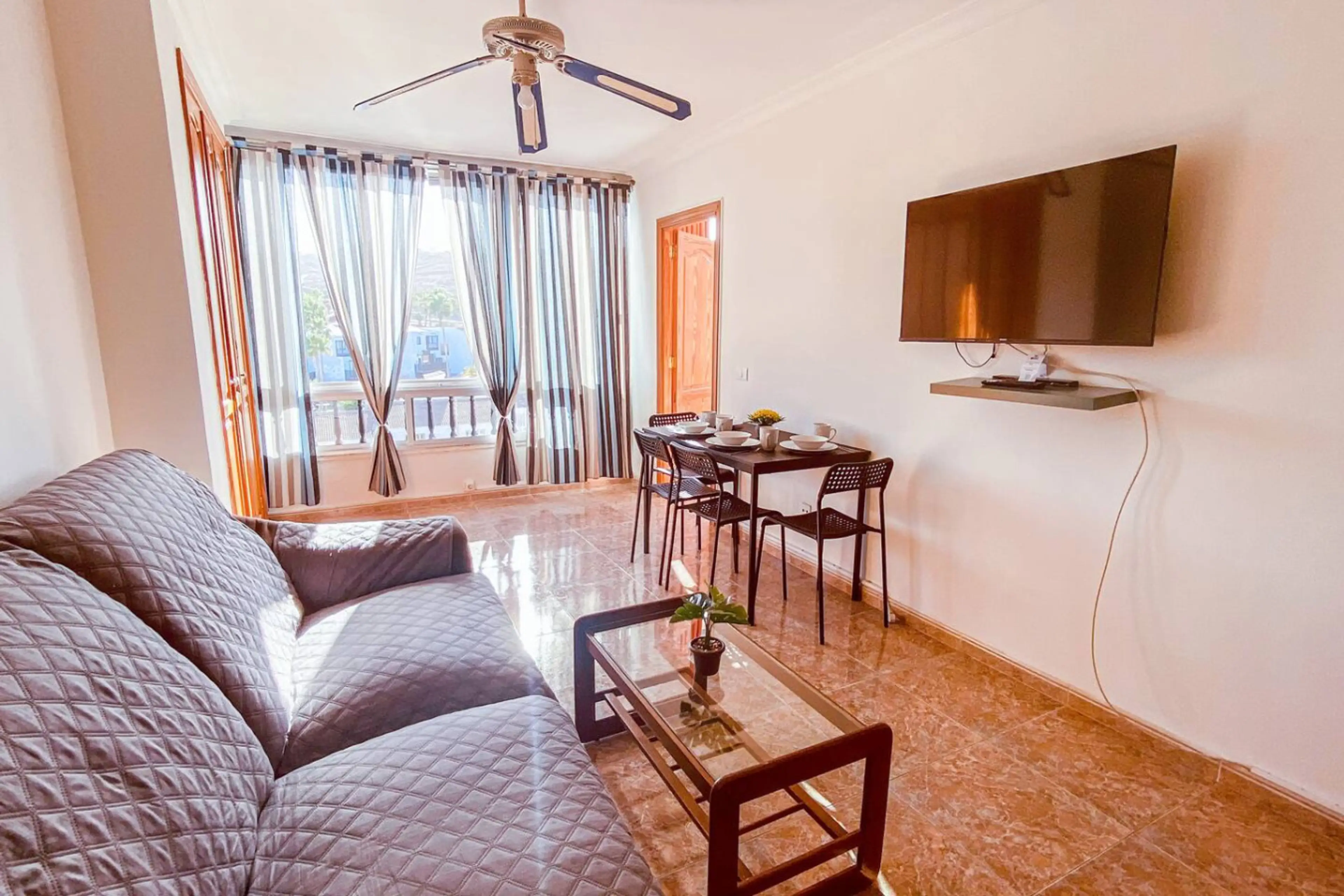 Acogedor apartamento de 2 dormitorios con increibles vistas al mar y a la montaña, situado al sur de Gran Canaria. Cuenta con 1 baño espacioso y salón-comedor con cocina abierta, cortinas oscurecedoras en el dormitorio principal cuenta con armarios empotrados. Desde el salón y el dormitorio princip...